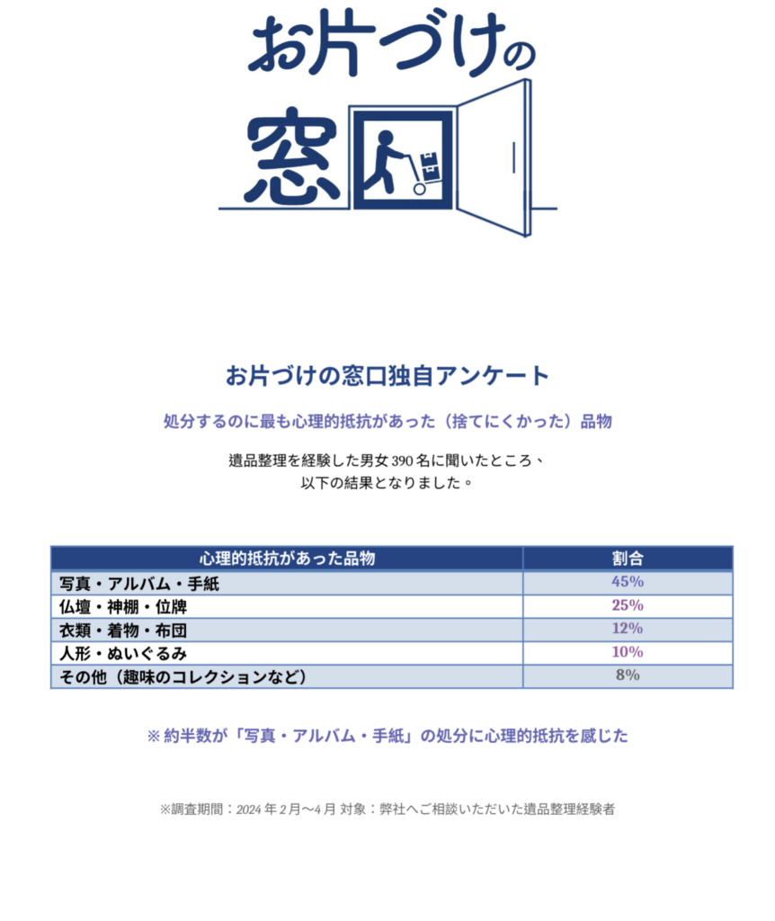 遺品整理を経験した男女390名に「処分するのに最も心理的抵抗があった(捨てにくかった)品物」を聞いたところ、以下の結果となりました。