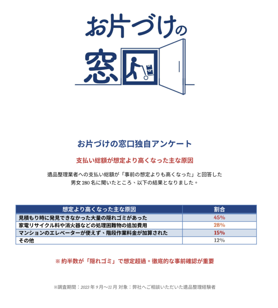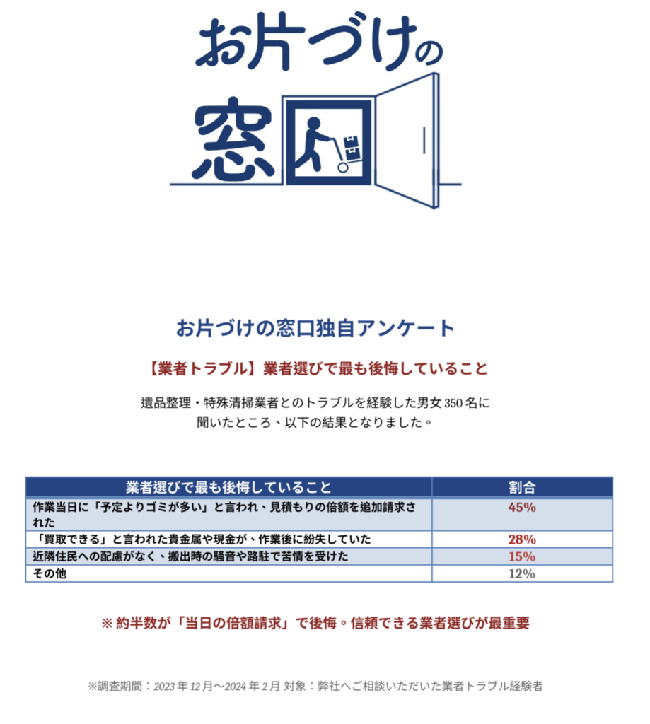 • 作業当日に「予定よりゴミが多い」と言われ、見積もりの倍額を追加請求された(45%)