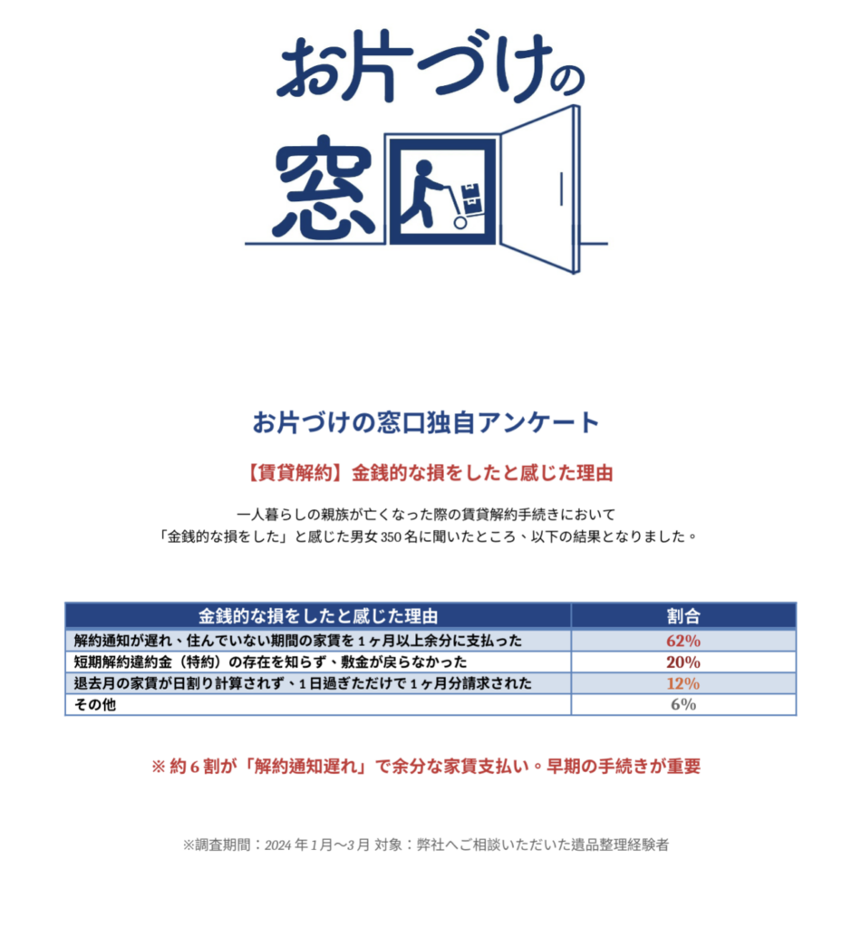 一人暮らしの親族が亡くなった際の賃貸解約手続きにおいて「金銭的な損をした」と感じた男女350名に、その理由を聞いたところ、以下の結果となりました。