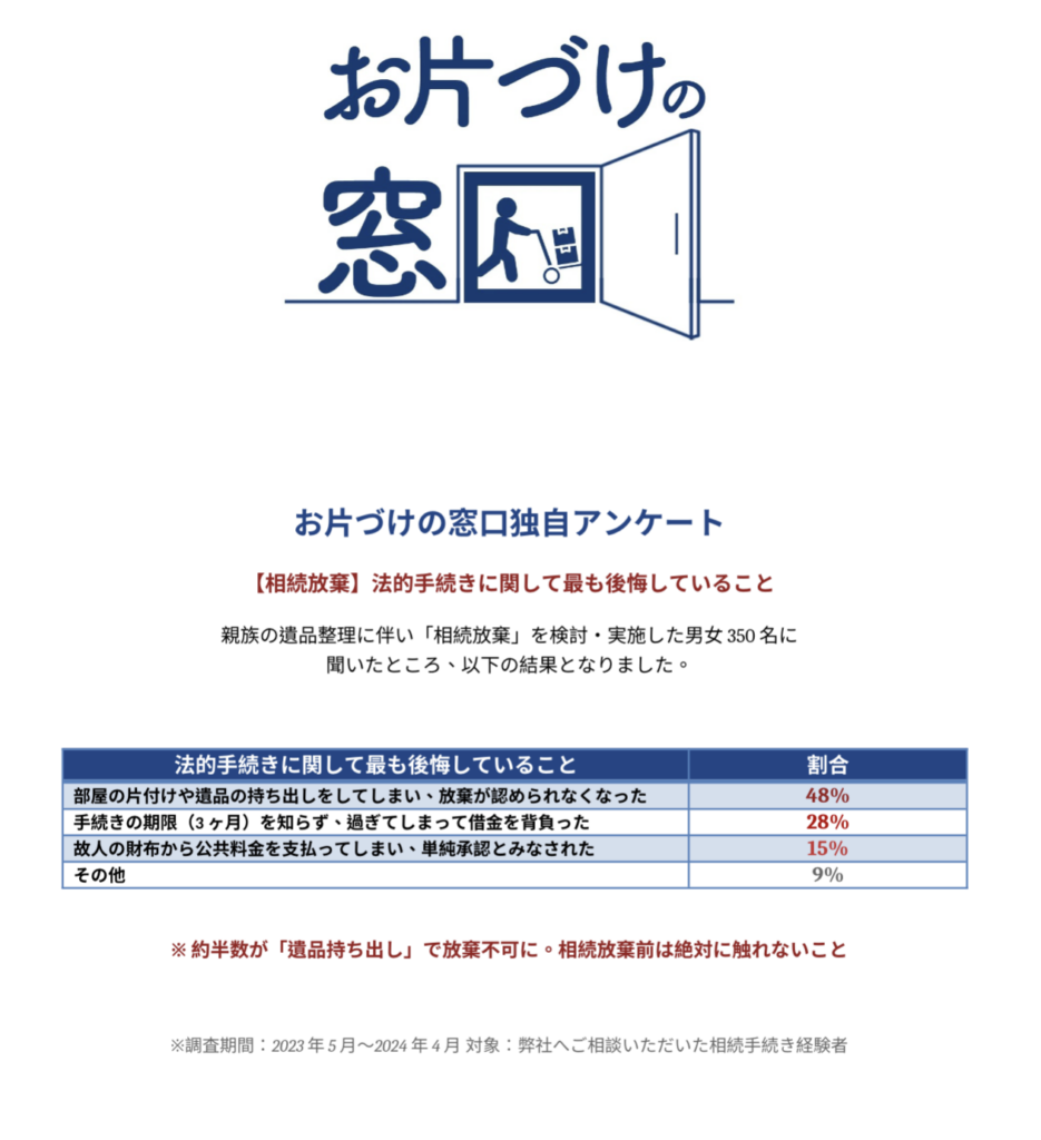 • 部屋の片付けや遺品の持ち出しをしてしまい、放棄が認められなくなった(48%)