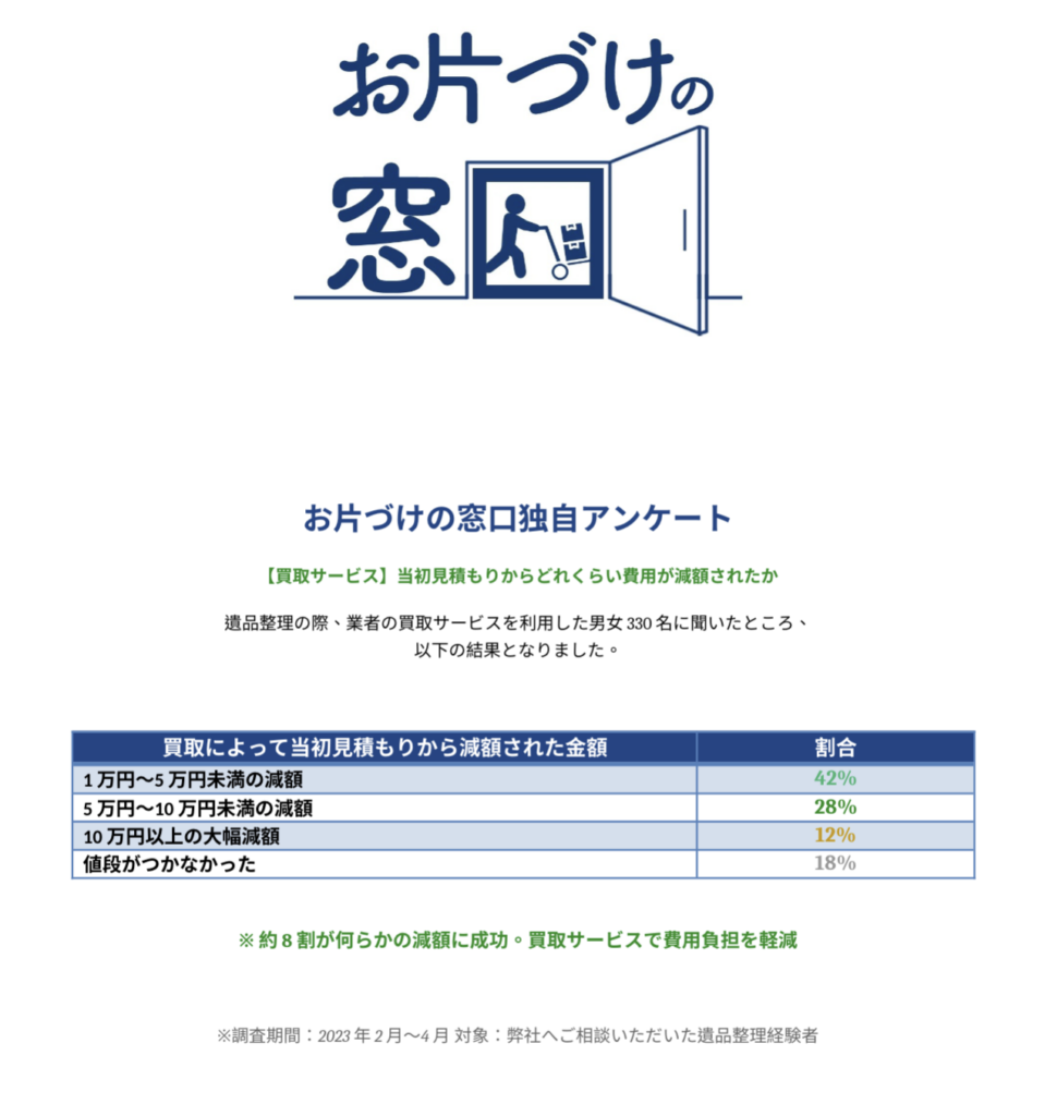 遺品整理の際、業者の買取サービスを利用した男女330名に「買取によって当初の見積もりからどれくらい費用が減額されたか」を聞いたところ、以下の結果となりました。