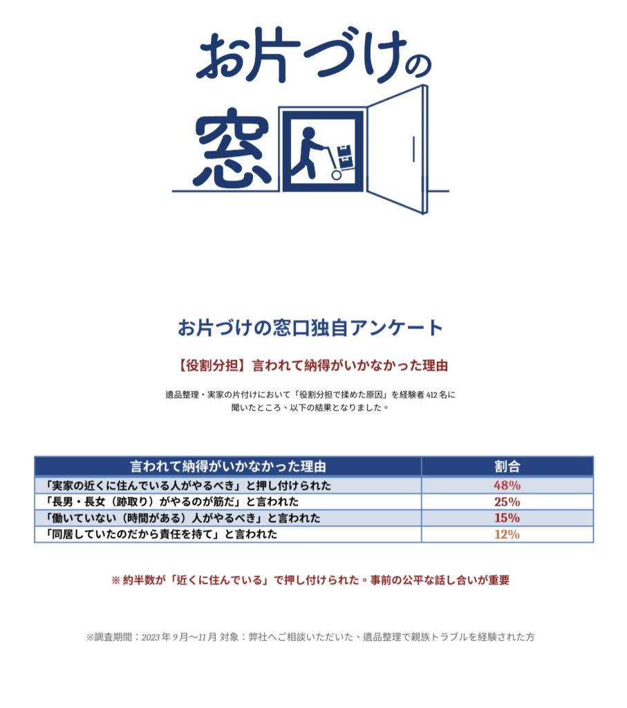 遺品整理・実家の片付けにおいて「役割分担で揉めた原因・言われて納得がいかなかった理由」を経験者412名に聞いたところ、以下の結果となりました。