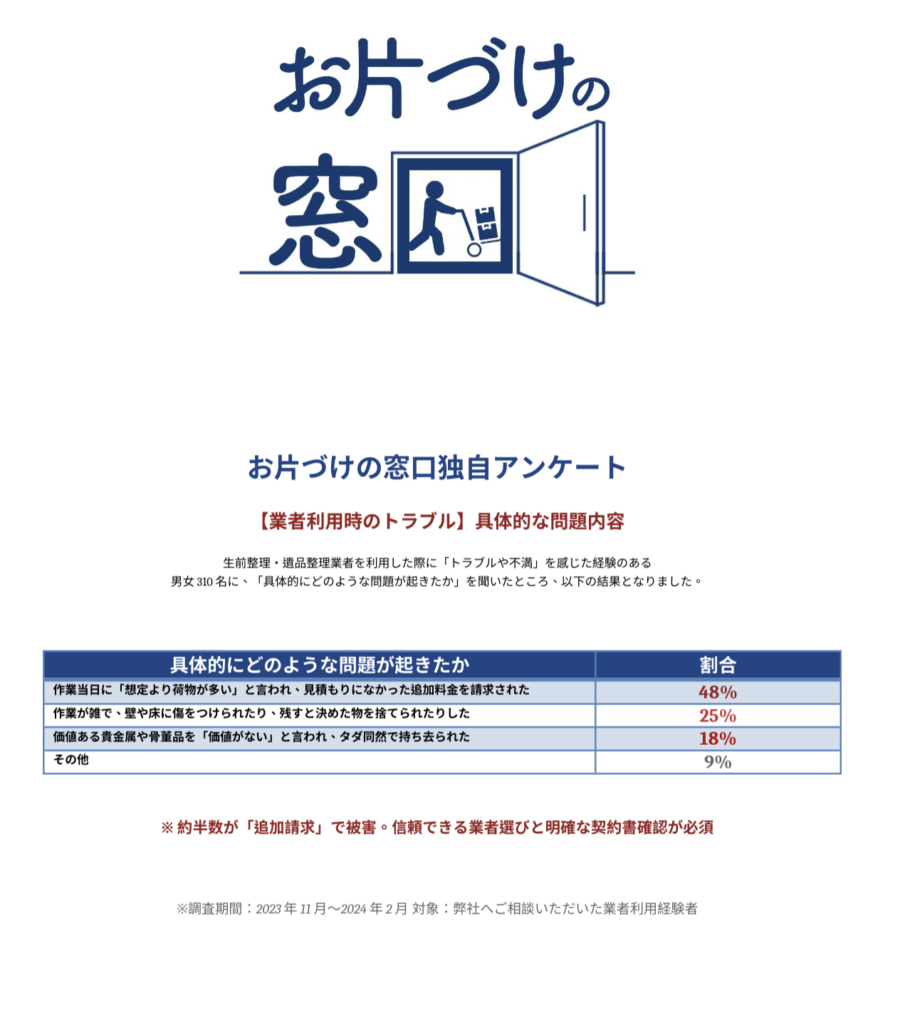 - 作業当日に「想定より荷物が多い」と言われ、見積もりになかった追加料金を請求された(48%)